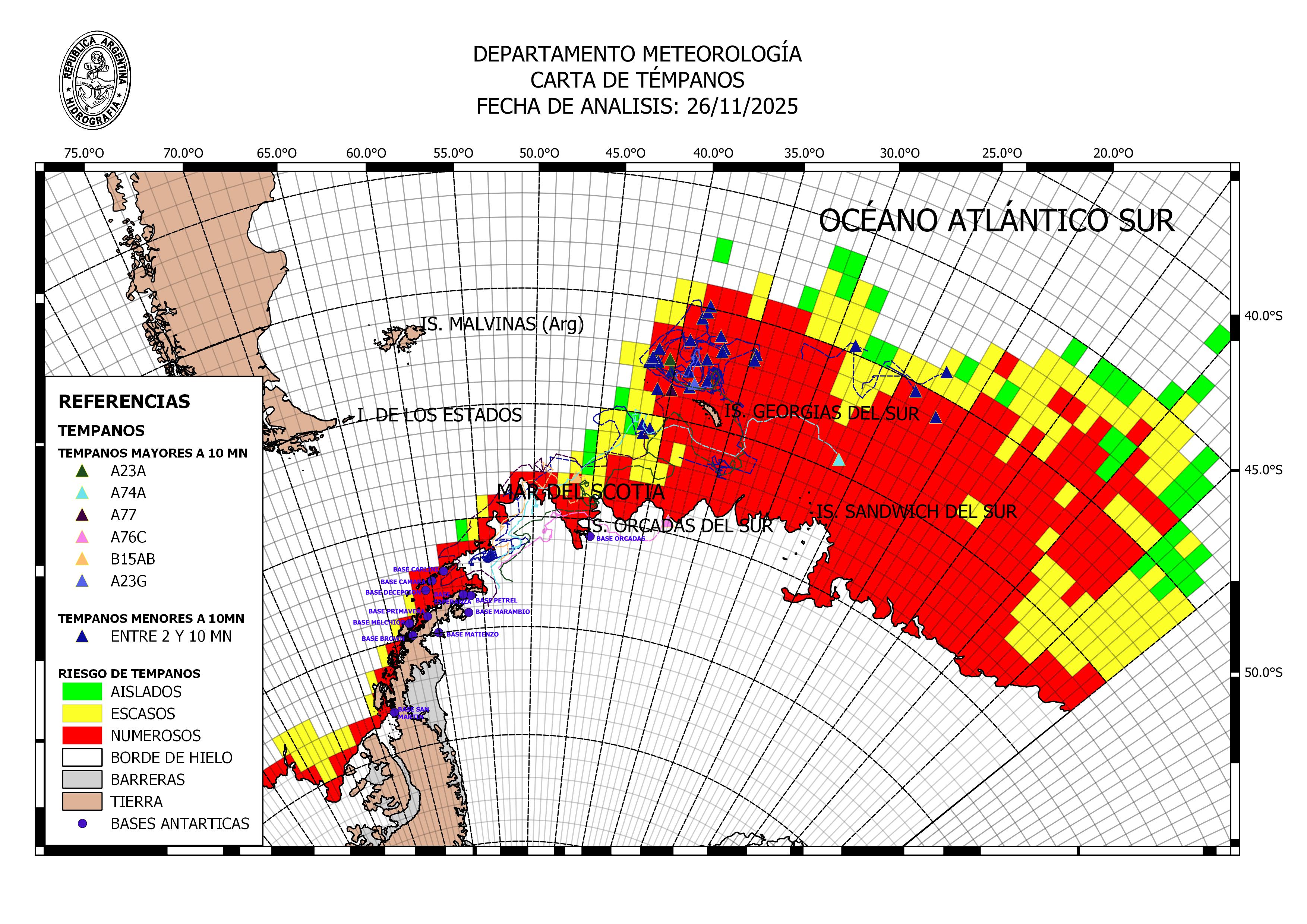 South Atlantic Ice Berg Analysis Argentine Naval Hydrographic Service ice-berg 26 Nov 2025 shn_antartida_riesgo_tempanos_20251126_pl_a | ||