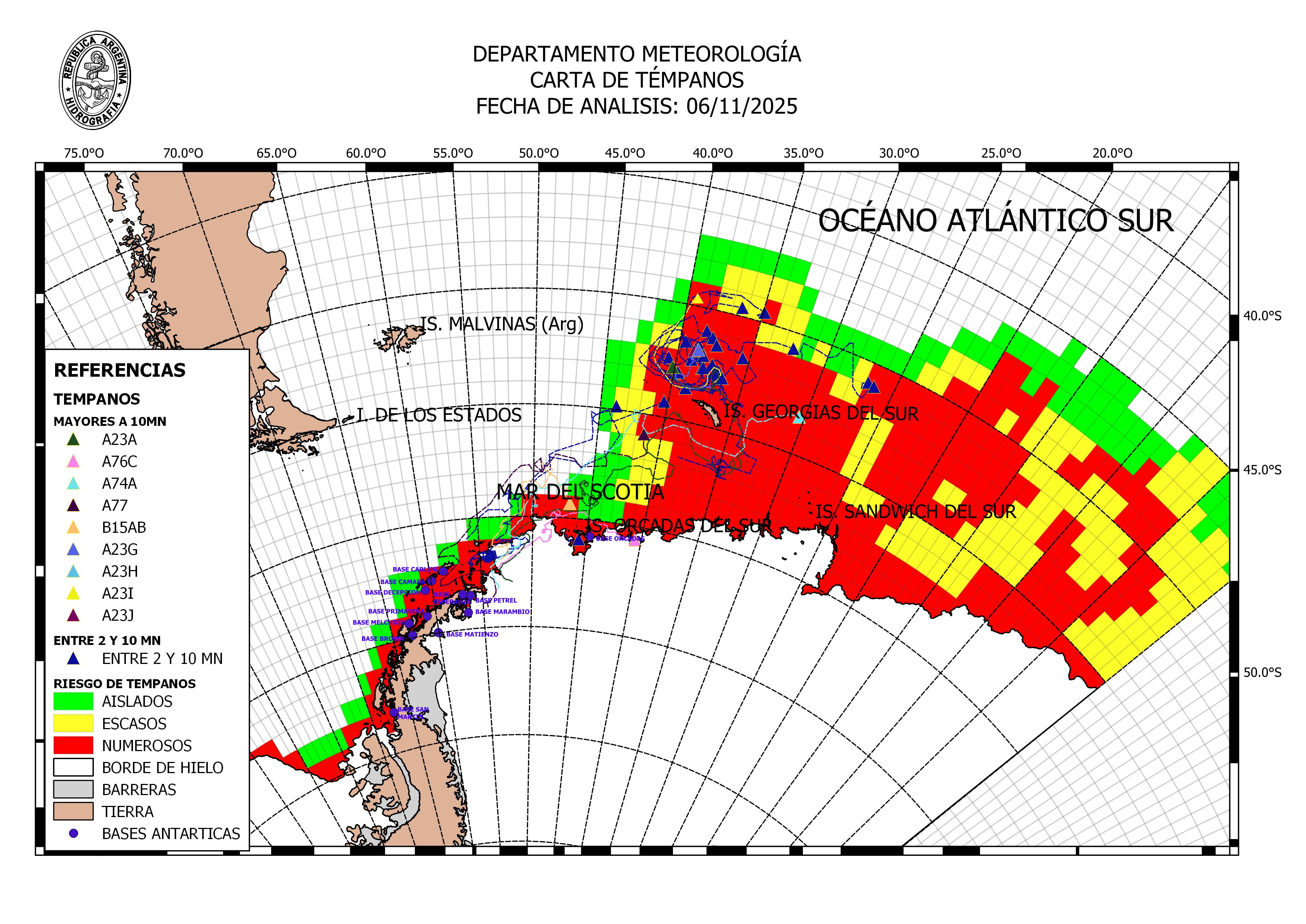 South Atlantic Ice Berg Analysis Argentine Naval Hydrographic Service ice-berg Nov 6, 2025 shn_antartida_riesgo_tempanos_20251106_pl_a | ||