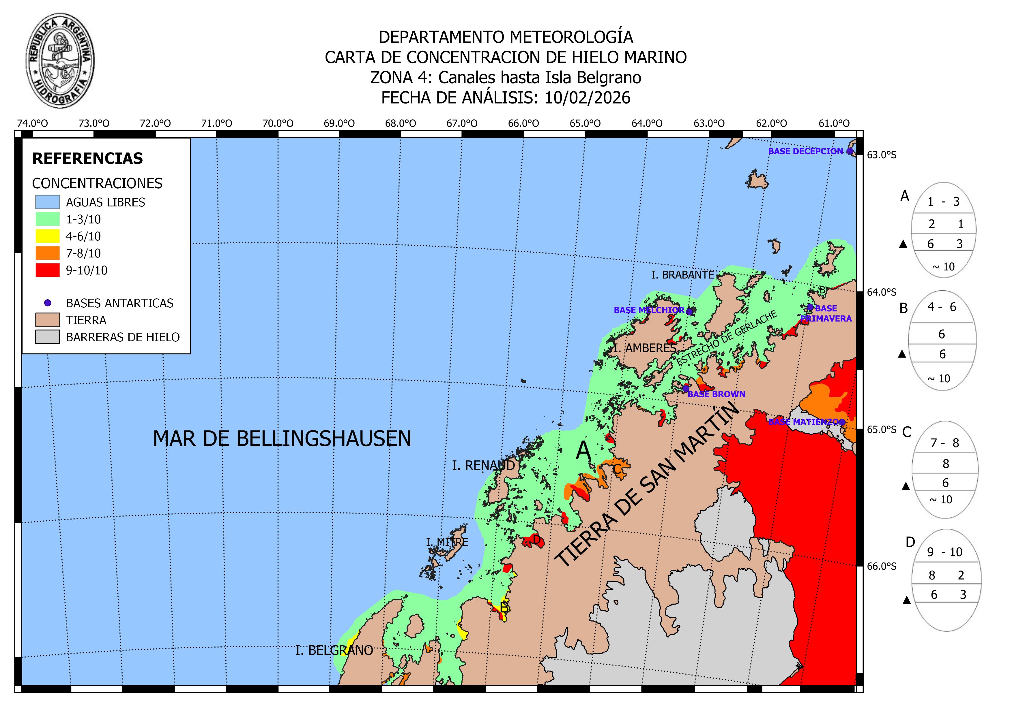 Antarctic Peninsula West Argentine Naval Hydrographic Service ice-concentration 10 Feb 2026 20260210_ZONA4 | ||