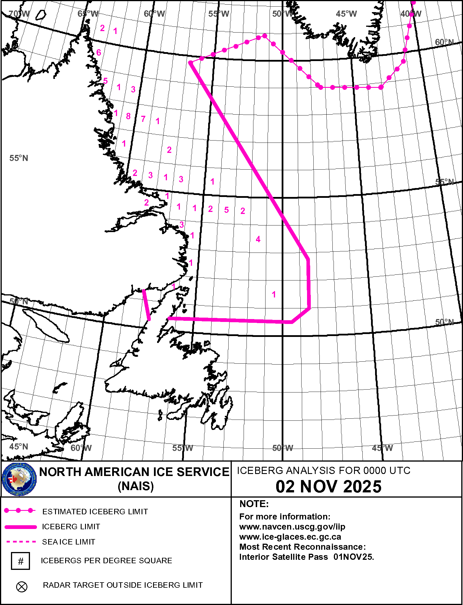Iceberg Analysis USCG International Ice Patrol ice-berg 2 Nov 2025 20251102_NAIS65 | ||