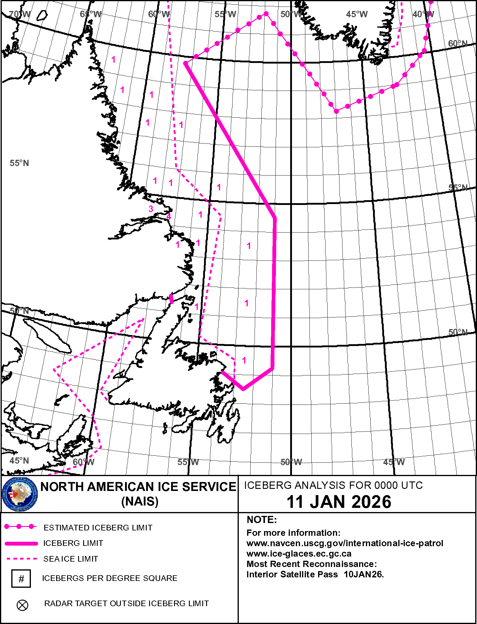 Iceberg Analysis USCG International Ice Patrol ice-berg 11 Jan 2026 20260111_NAIS65 | ||