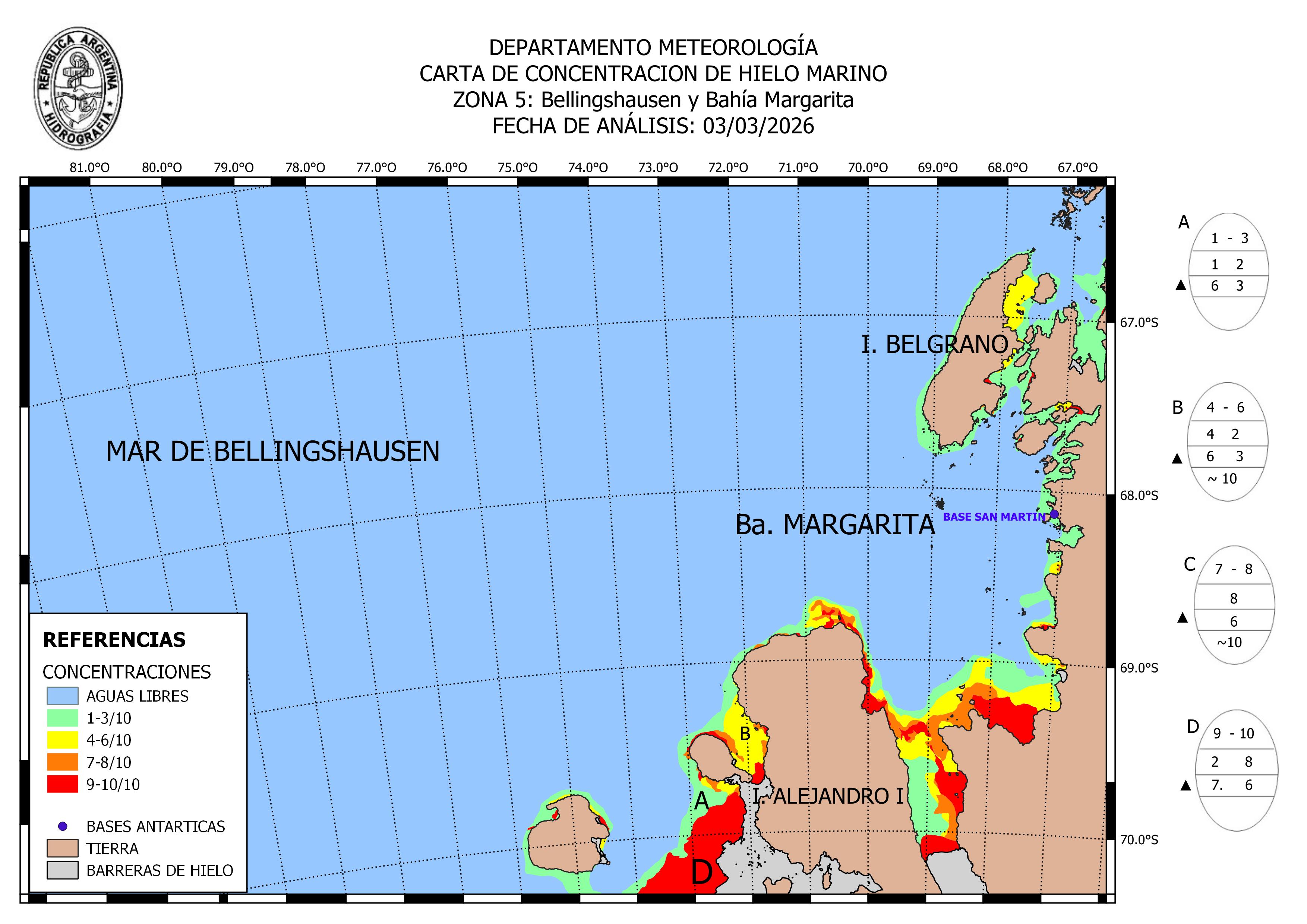 Bellingshausen Sea and Marguerite Bay Argentine Naval Hydrographic Service ice-concentration 3 Mar 2026 20260303_ZONA5 | ||