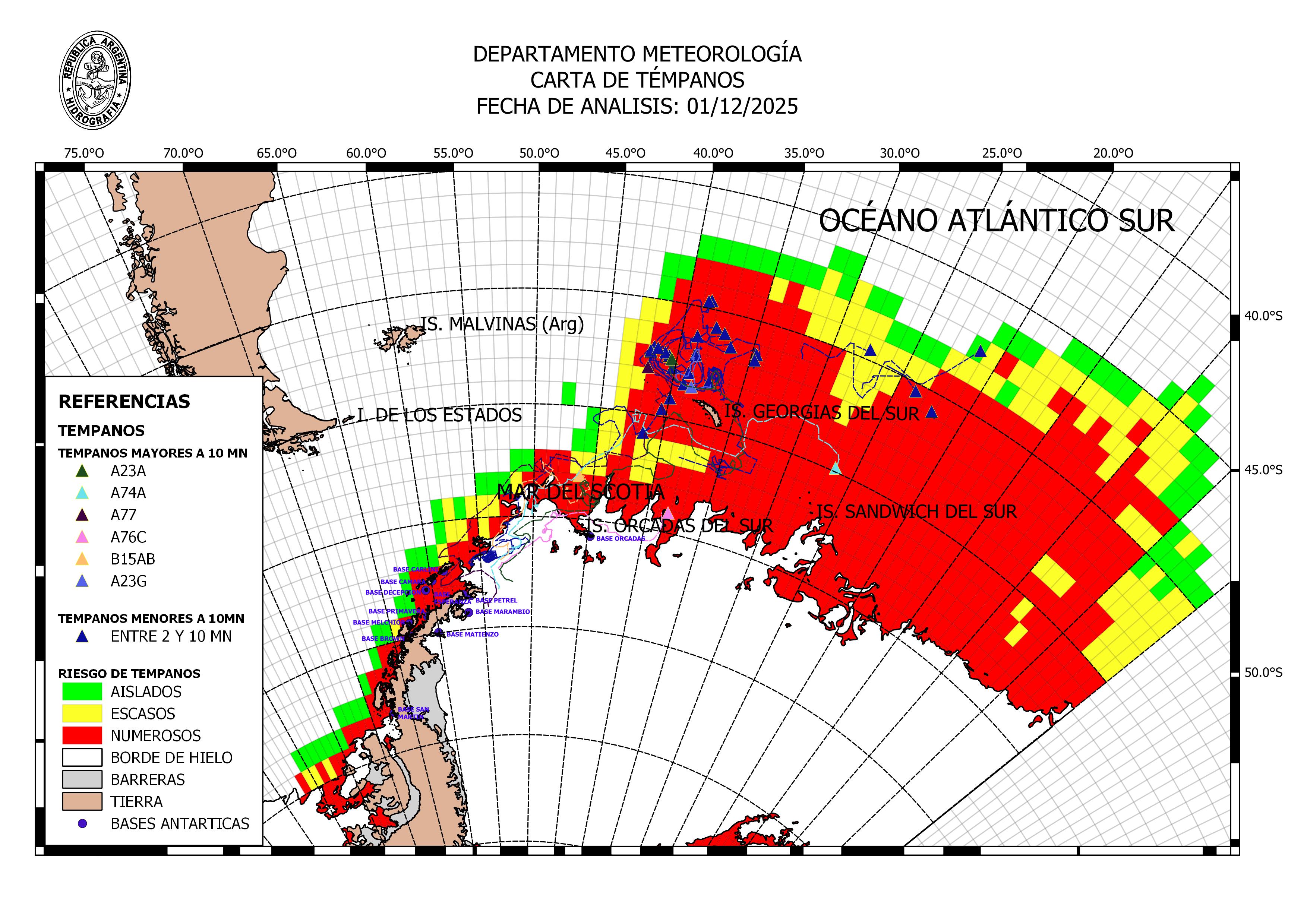 South Atlantic Ice Berg Analysis Argentine Naval Hydrographic Service ice-berg 1 Dec 2025 shn_antartida_riesgo_tempanos_20251201_pl_a | ||
