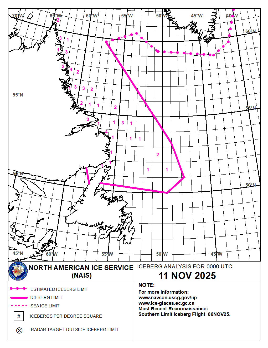 Iceberg Analysis USCG International Ice Patrol ice-berg 11 Nov 2025 20251111_NAIS65 | ||