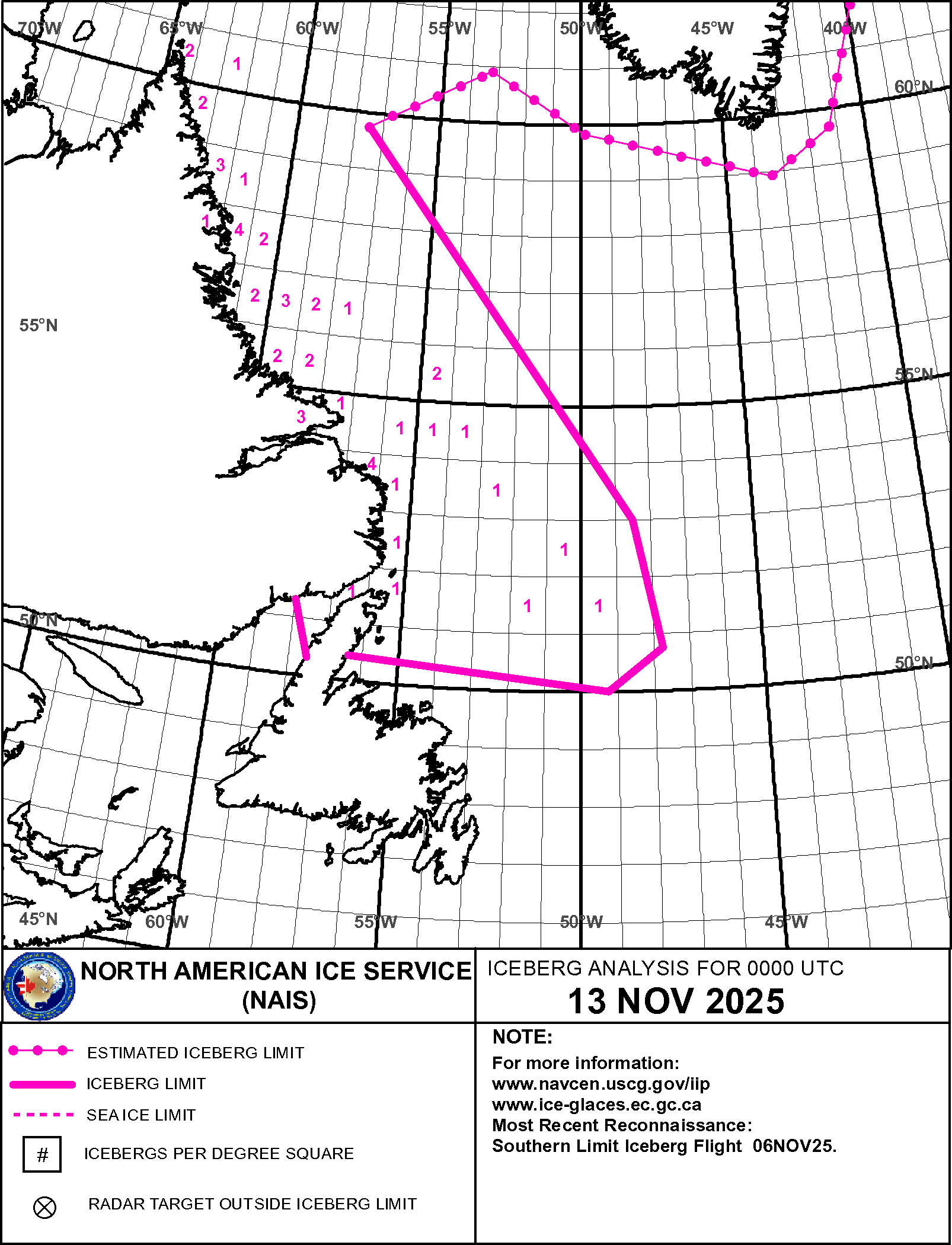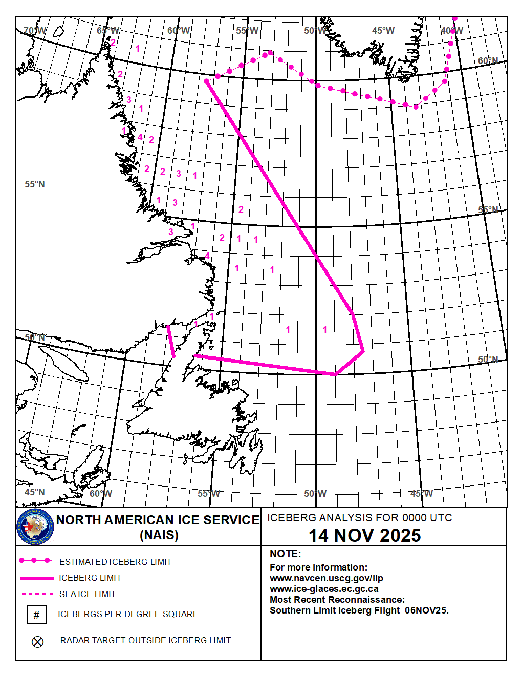 Iceberg Analysis USCG International Ice Patrol ice-berg 14 Nov 2025 20251114_NAIS65 | ||