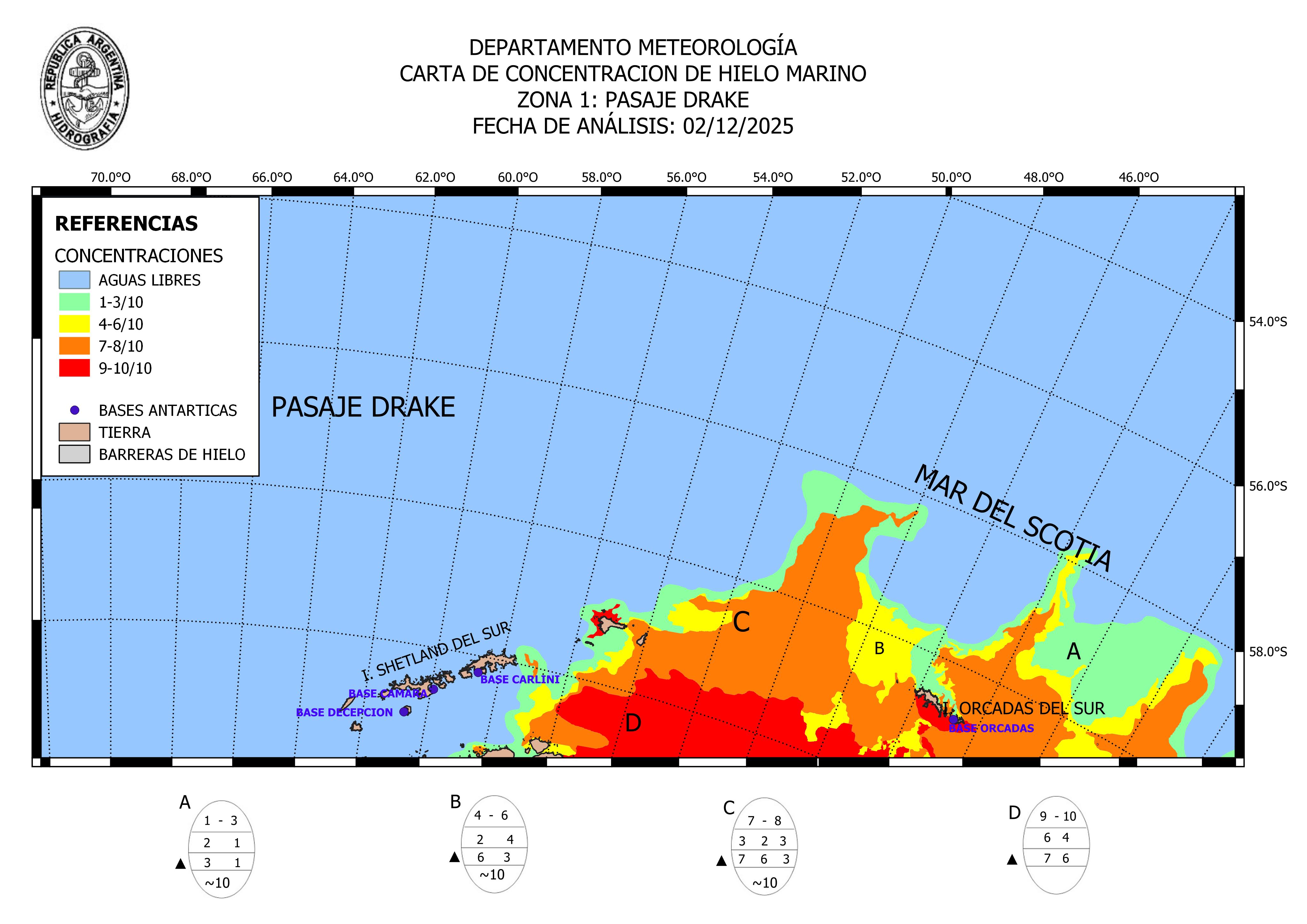 Drake Passage - Concentration Argentine Naval Hydrographic Service ice-concentration 2 Dec 2025 20251202_ZONA1 | ||