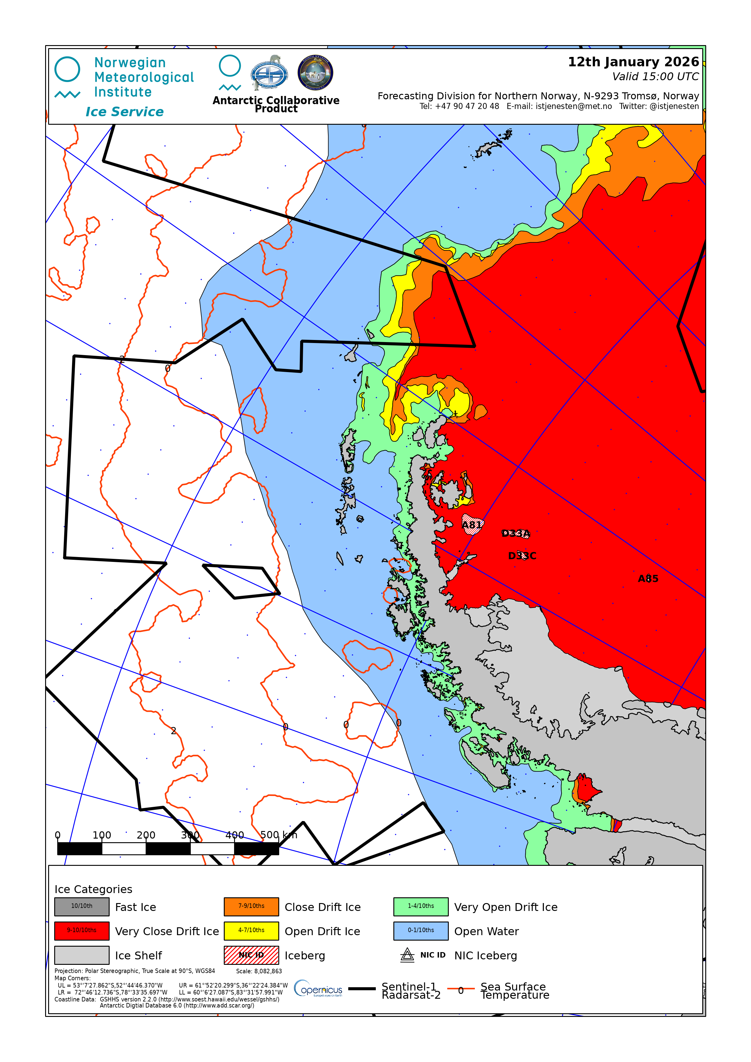Bransfield Strait Norwegian Meteorological Institute - Norwegian Ice Service ice-concentration Jan 13, 2026 20260113 | ||