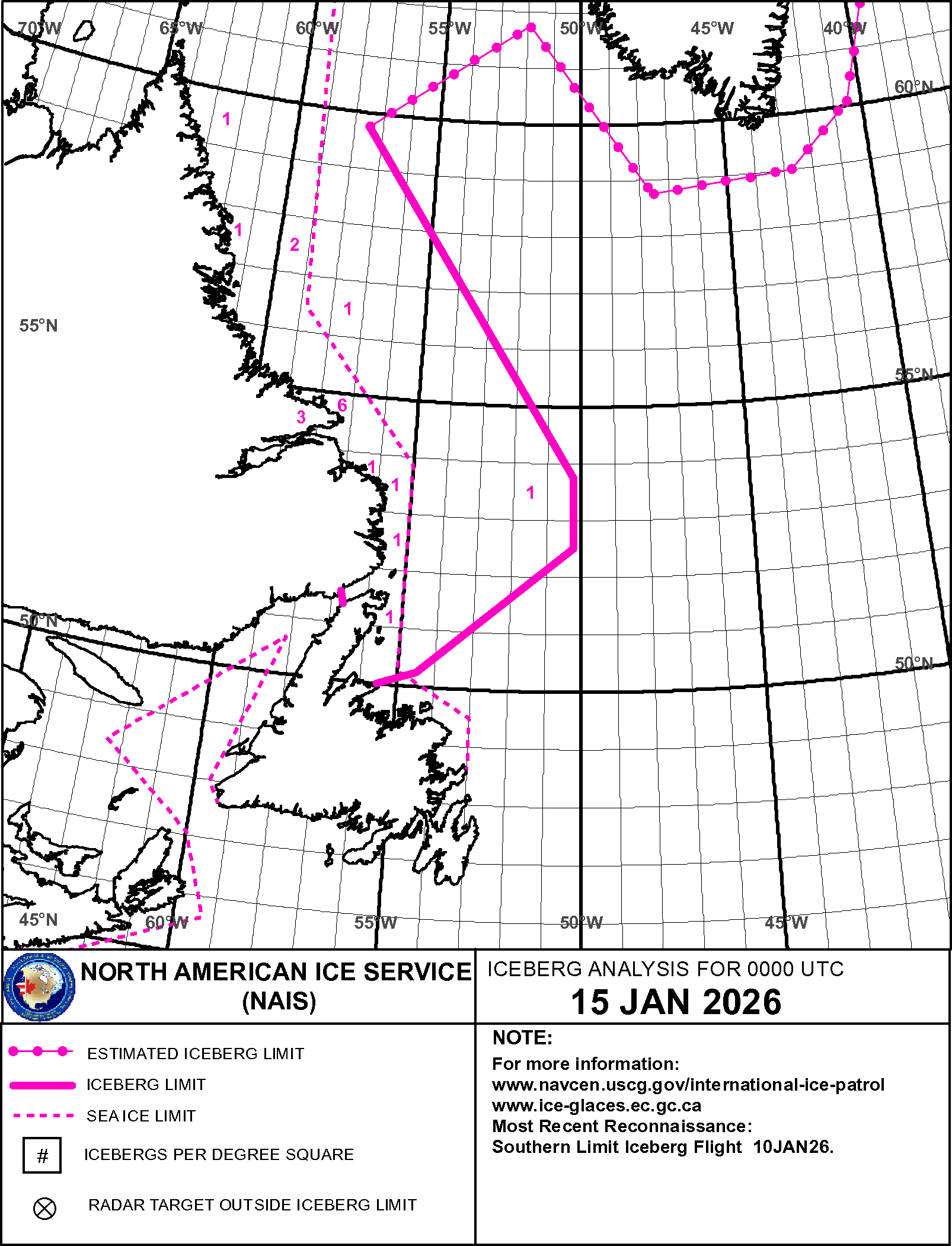 Iceberg Analysis USCG International Ice Patrol ice-berg Jan 15, 2026 20260115_NAIS65 | ||