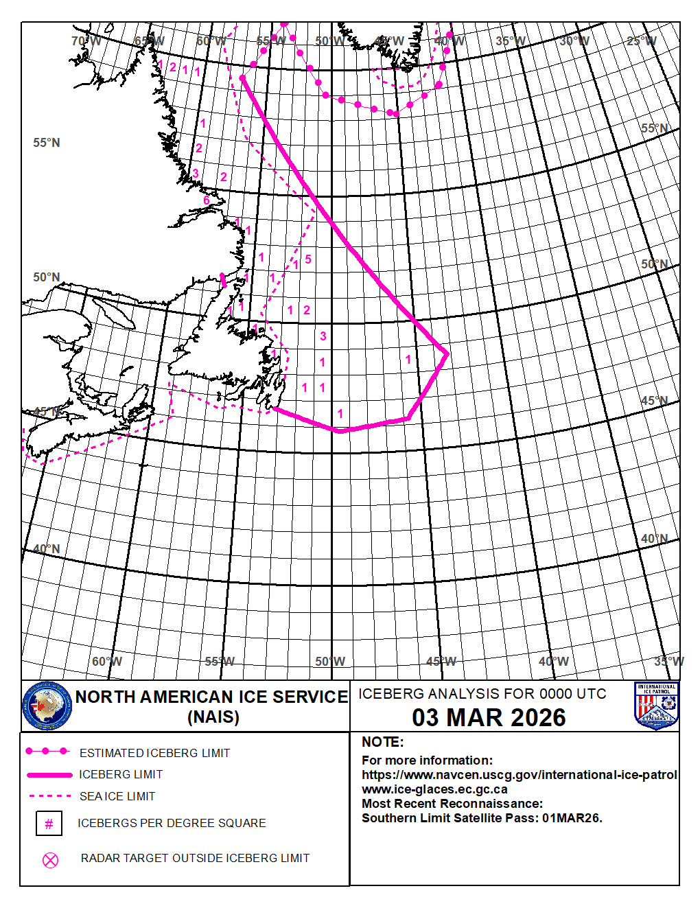 Iceberg Analysis USCG International Ice Patrol ice-berg 3 Mar 2026 20260303_NAIS65 |