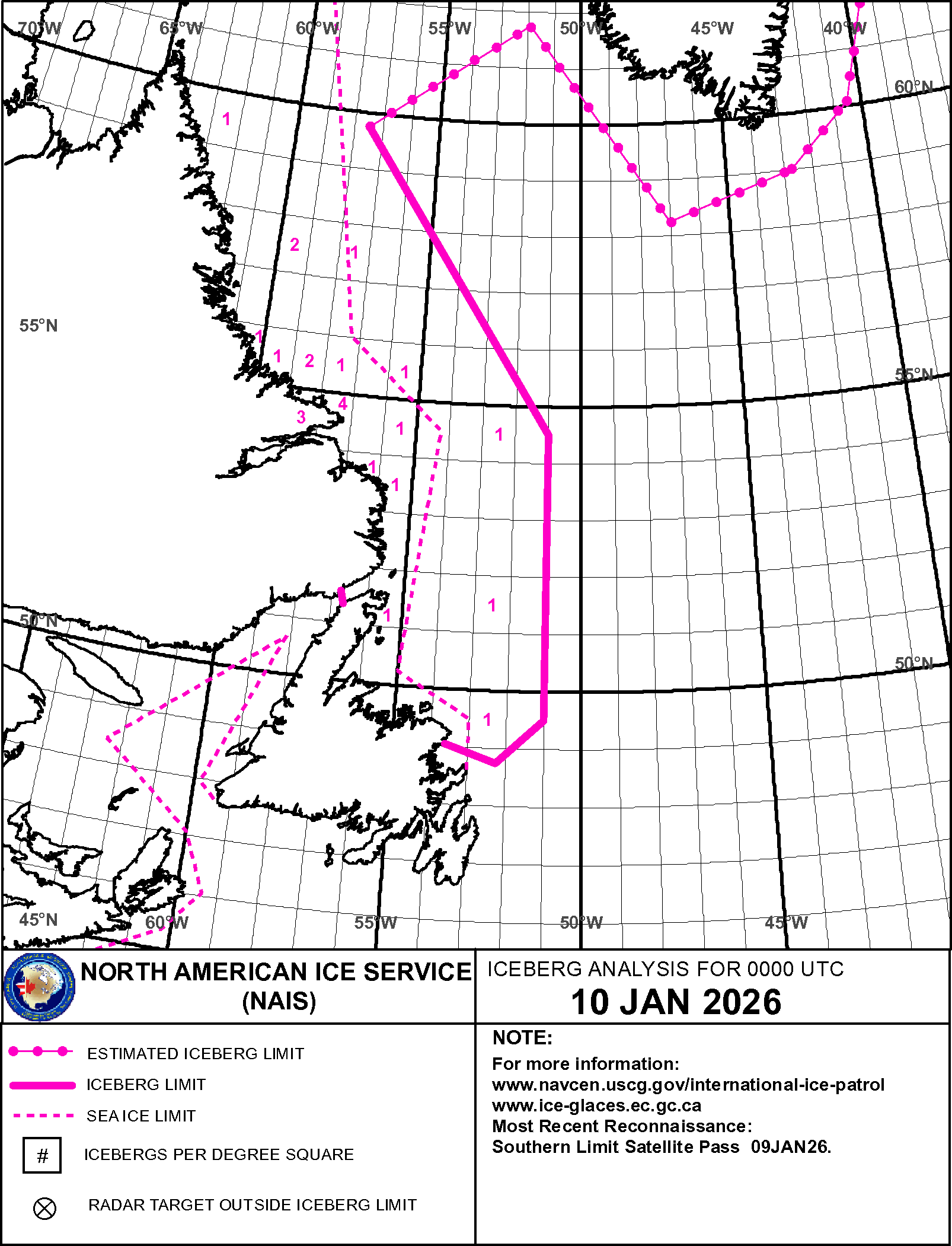 Iceberg Analysis USCG International Ice Patrol ice-berg Jan 10, 2026 20260110_NAIS65 |
