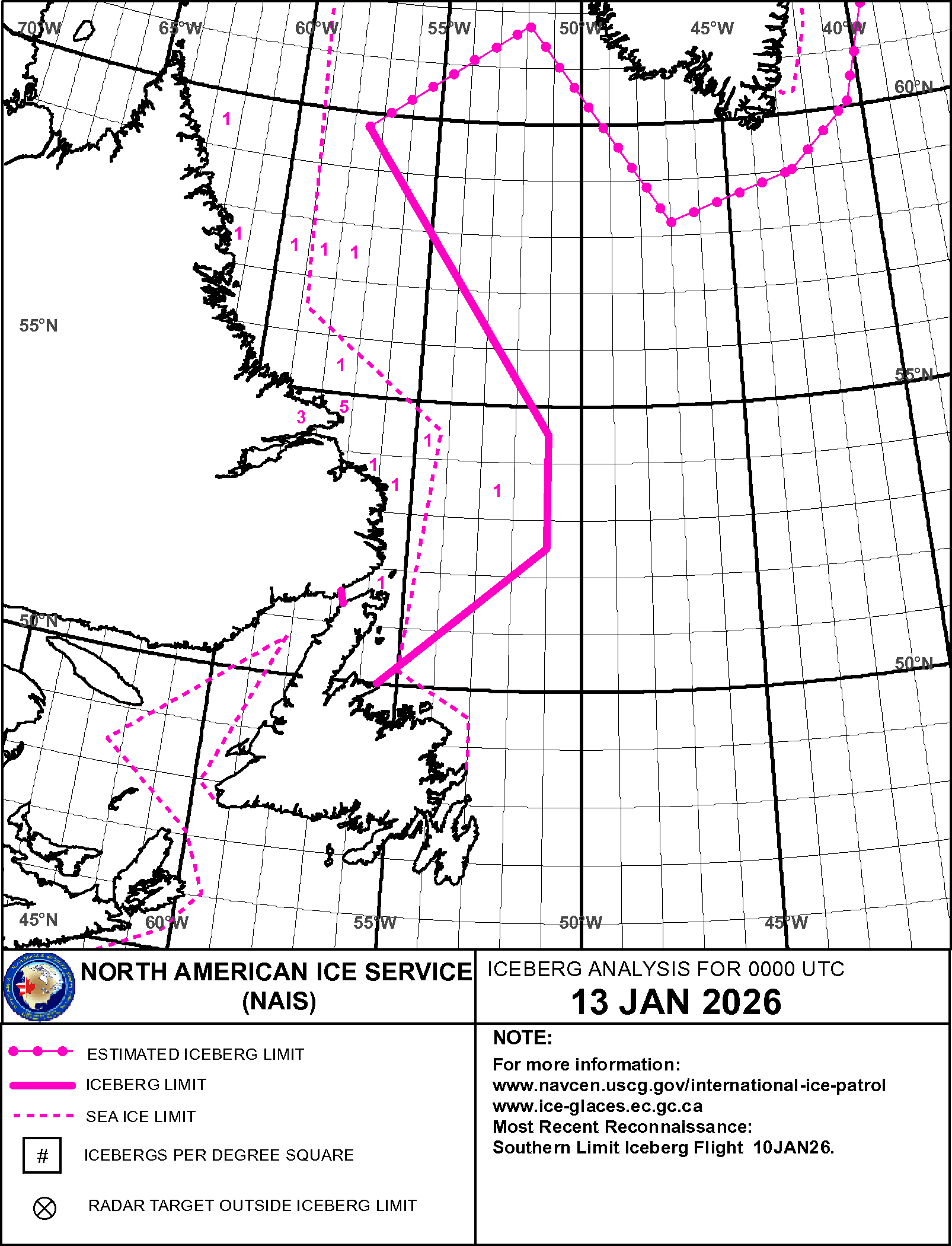 Iceberg Analysis USCG International Ice Patrol ice-berg Jan 13, 2026 20260113_NAIS65 | ||
