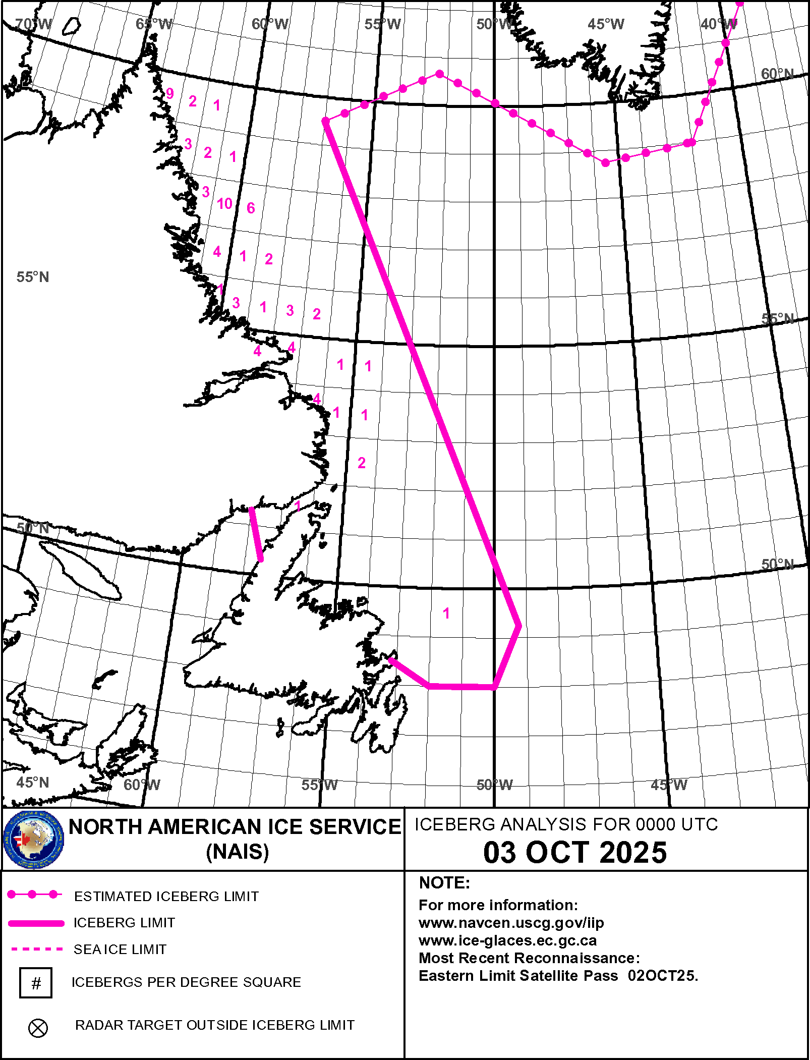 Iceberg Analysis USCG International Ice Patrol ice-berg 3 Oct 2025 20251003_NAIS65 | ||